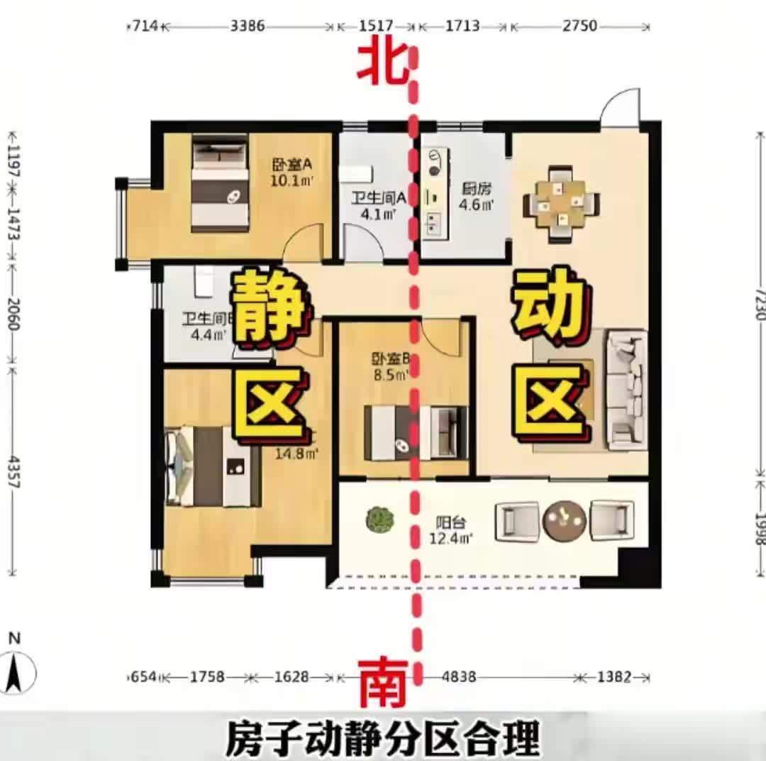 核心技巧:动区(客厅、餐厅、厨房)和静区(卧室、书房)分开,大门进来先到动区,再到静区。动区静区有过道隔开,就算客厅再吵,卧室里也能安安稳稳睡觉。
